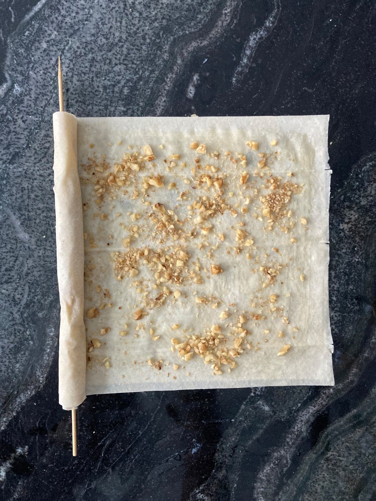 Die beiden Blätter jeweils mit geschmolzener Butter bestreichen und übereinanderlegen. Mit ca. 1 1/2 EL der Füllung bestreuen. Den Holzspieß an die untere, schmale (ca. 20 cm breite) Kante legen und die Teigblätter damit relativ straff aufrollen.