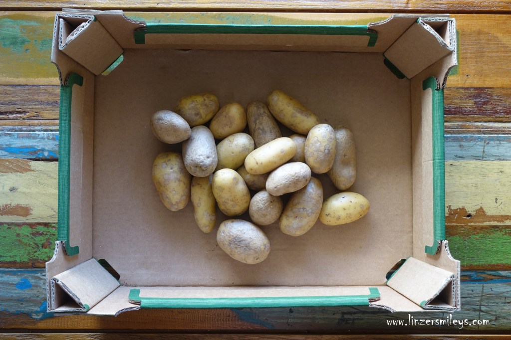 Ganz unten lagen in meiner „Rette-mich-Box“* speckige Erdäpfel (festkochende Kartoffeln), die ideal für die Zubereitung von (beispielsweise) Salat, Petersilkartoffeln oder auch Erdäpfelschmarren sind.