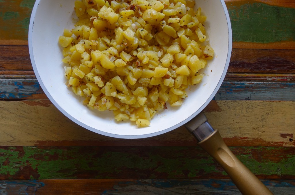 Die Kartoffeln in der Schale weich kochen, dann schälen, auskühlen lassen und in kleine Stücke schneiden (wenn du gekochte Kartoffeln vom Vortag hast, kannst du stattdessen auch diese verwenden 😉).