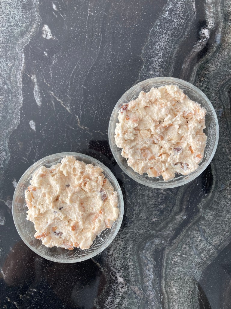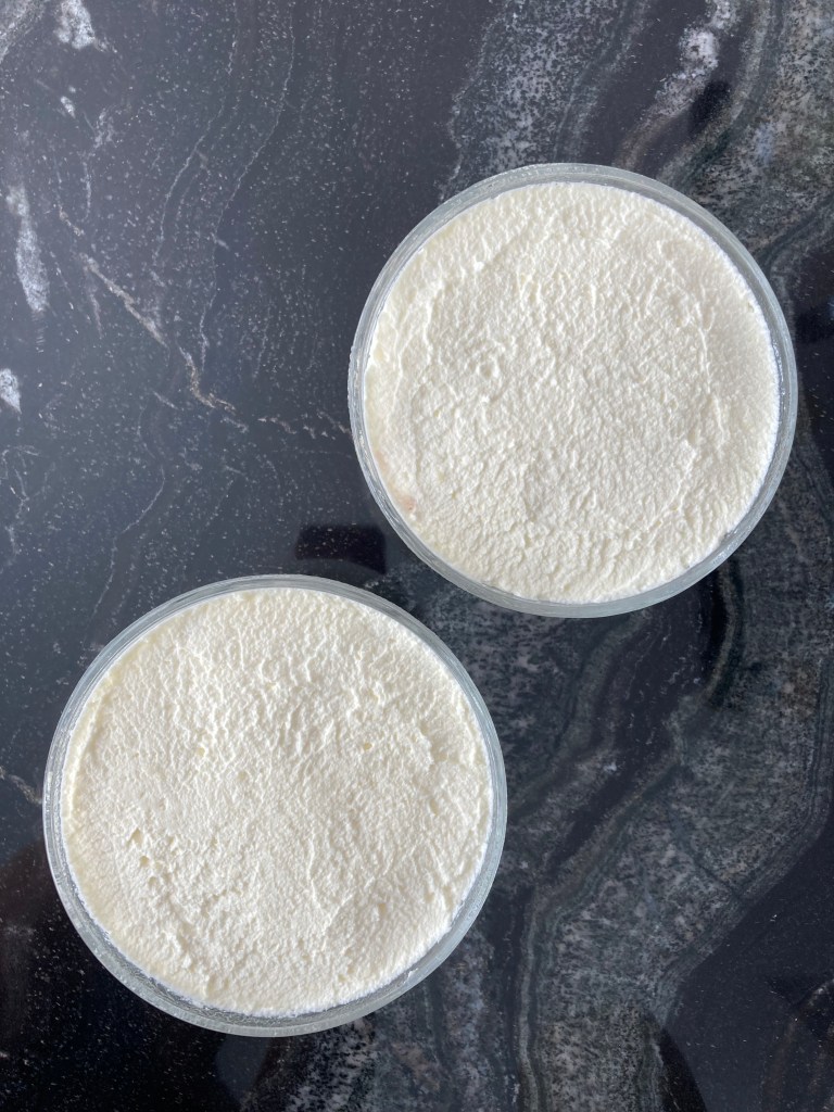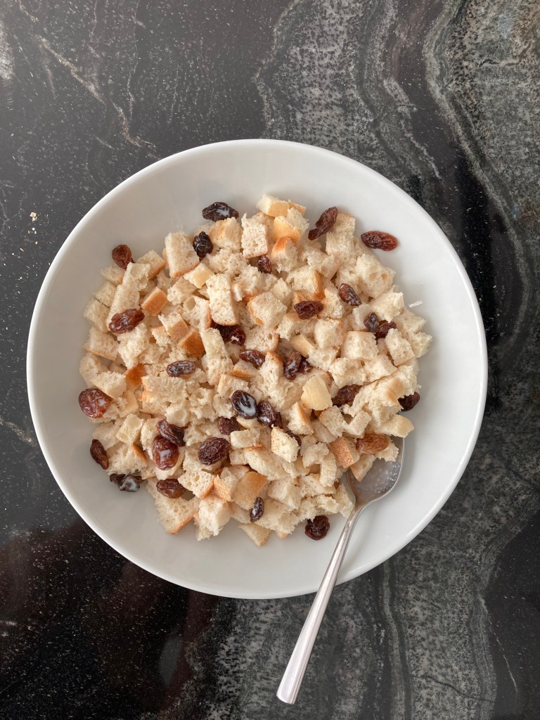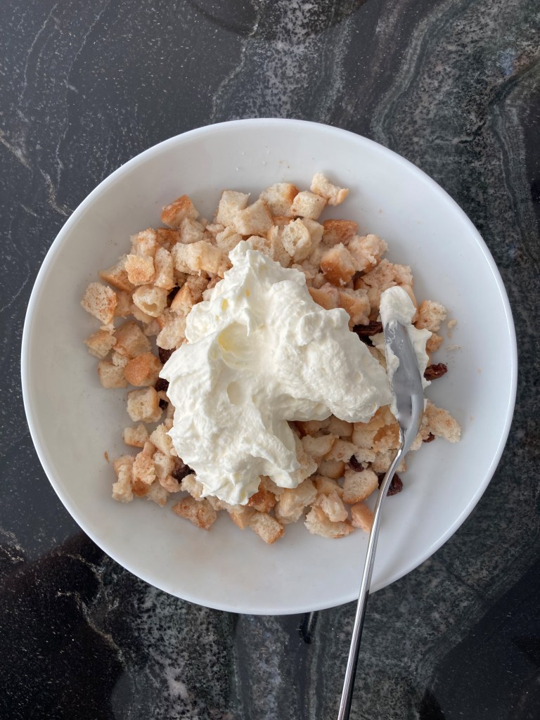 Diese werden in kleine Würfel geschnitten, anschließend mit warmer, leicht gezuckerter Milch getränkt, danach mit Rum-Rosinen (oder einfach nur Rum 😉), Zimt (nach Belieben auch mit geriebenen und gerösteten Haselnüssen) sowie mit etwas Vanille-Obers verfeinert. Diese Masse wird dann entweder in eine große, flache Form (oder – wie hier – in mehrere kleine Portions-Förmchen) gegeben, mit (dem restlichen) Vanille-Obers bedeckt und für mindestens 2 Stunden kühl gestellt.