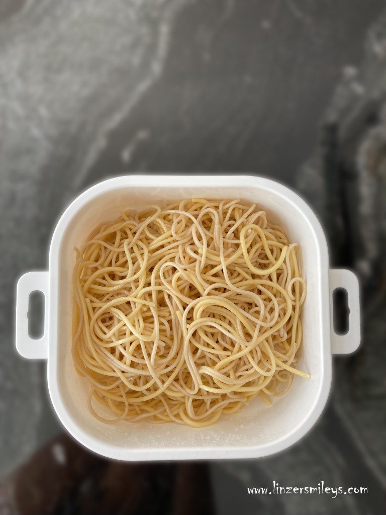 Im Endeffekt war das aber kein Problem, sondern eher ein Glück, denn am Tag darauf habe ich mit den Pasta-Resten einen köstlichen Nudel-Salat nach diesem Rezept hier (klick!)* zubereitet und festgestellt, dass er mit Spaghetti sogar „ein Eitzerl“ (österr. für „ein bisschen“) besser schmeckt als mit den Nudelformaten, die ich bisher dafür verwendet hatte 😊!