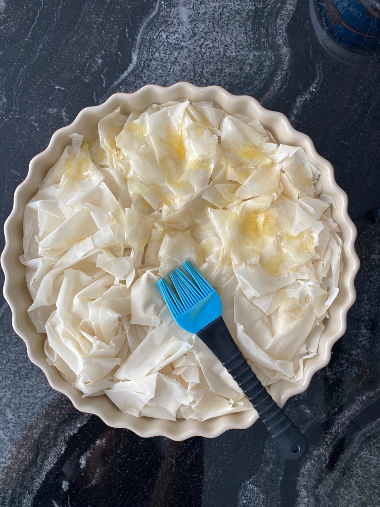 Eine griechisch inspirierte Tarte, die nicht nur mit sommerlichen Beeren und Pistazien dekoriert 😊 (klick!), sondern auch mit herbstlichen Früchten garniert überaus köstlich aussieht – nicht wahr?! Und das, obwohl sie eigentlich ziemlich „zerzaust und zerknittert“ daherkommt 🙃… Patsavouropita bedeutet auf Deutsch übersetzt „Putzlappen“–Kuchen – für seine Zubereitung brauchst du nämlich Filoteigblätter (und/oder Filoteig-Reste), die nicht ordentlich geschichtet, sondern „einfach nur“ zusammengerafft werden (siehe dazu die Bebilderung ein Stück weiter unten in diesem Post 😉!).