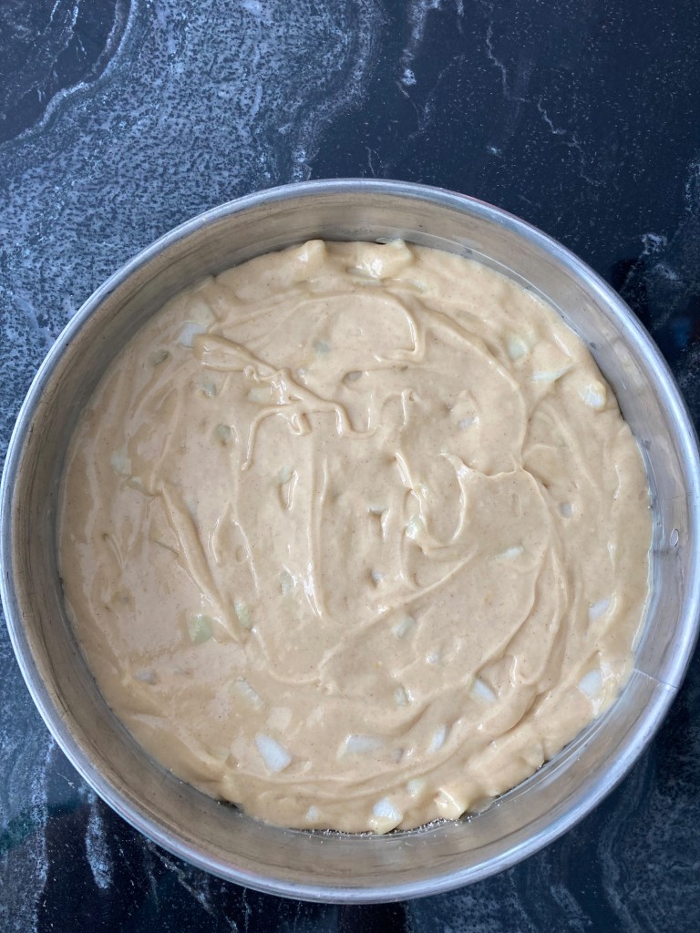 Die Birnenwürfel mit einem Spatel unter den Teig heben. Diesen dann in die vorbereitete Springform füllen. Die Oberfläche glattstreichen (Foto 1 hier unten links).