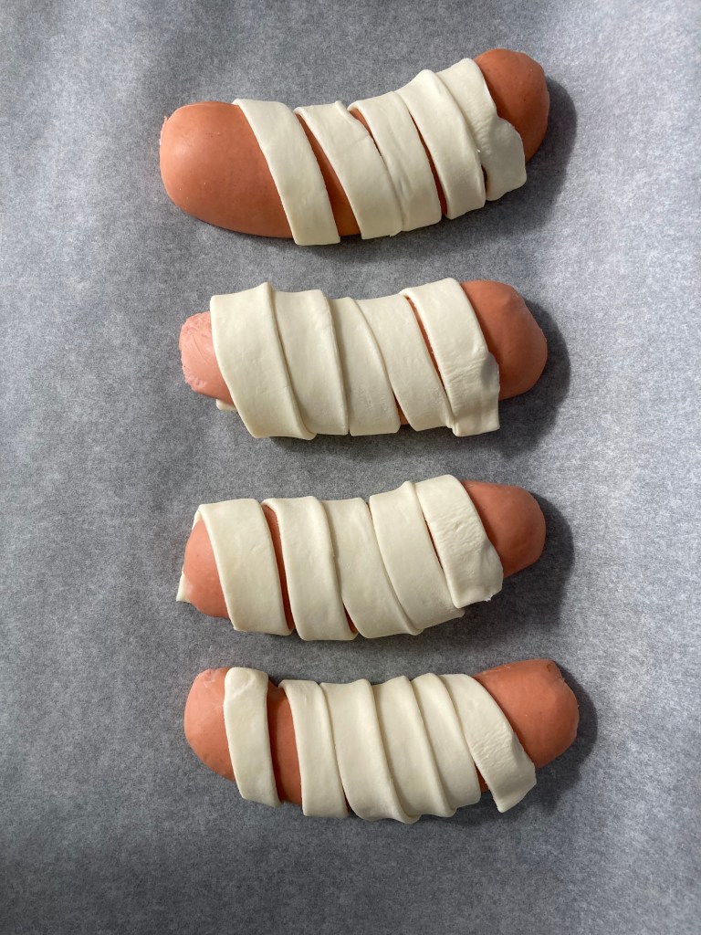 Die Mumien in den vorgeheizten Ofen schieben (Ober-/Unterhitze, 200°C) und für ca. 20-25 Minuten goldgelb backen. Auskühlen lassen und mit Olivenscheiben sowie mit Senf-, Mayo- und/oder Ketchuptupfern als Augen 👀 garnieren.