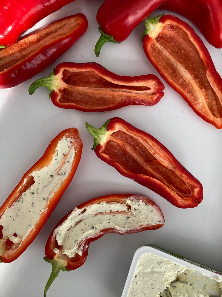 - Frischkäse zum Füllen (hier: Bio-Doppelrahmfrischkäse mit Kräutern) – pro Paprikahälfte wird ca. 1 gehäufter TL benötigt