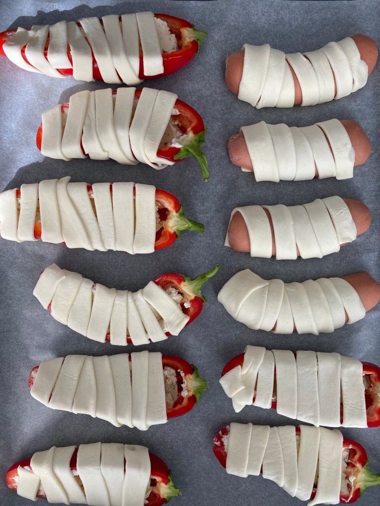 Bist du bereit für Halloween oder noch auf der Suche nach leckeren Grusel-Rezept-Ideen?? Wenn Letzteres der Fall ist, dann kann ich dir diese hier anbieten: zweierlei knusprig gebackene Mumien im Blätterteigmantel – die einen sind vegetarisch (mit Paprika und Frischkäse), die anderen werden mit Wurst (mit Knacker*) zubereitet 🎃.