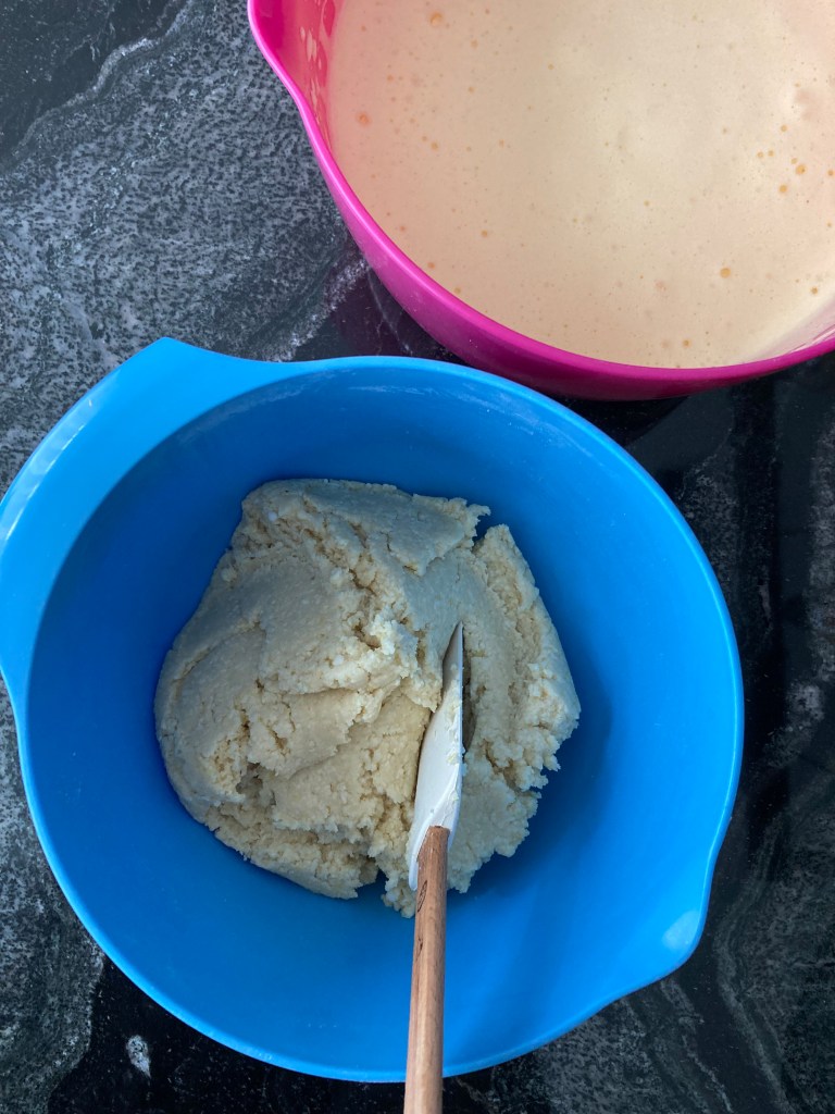 In einer zweiten Schüssel Eier, Wasser, Feinkristall- und Vanillezucker mit einem Handmixer für mindestens 5 Minuten zu einer dickschaumigen Masse rühren. Diese dann portionsweise unter den Mandel-Schoko-Öl-Mix heben – dabei am besten einen Spatel verwenden 😉.