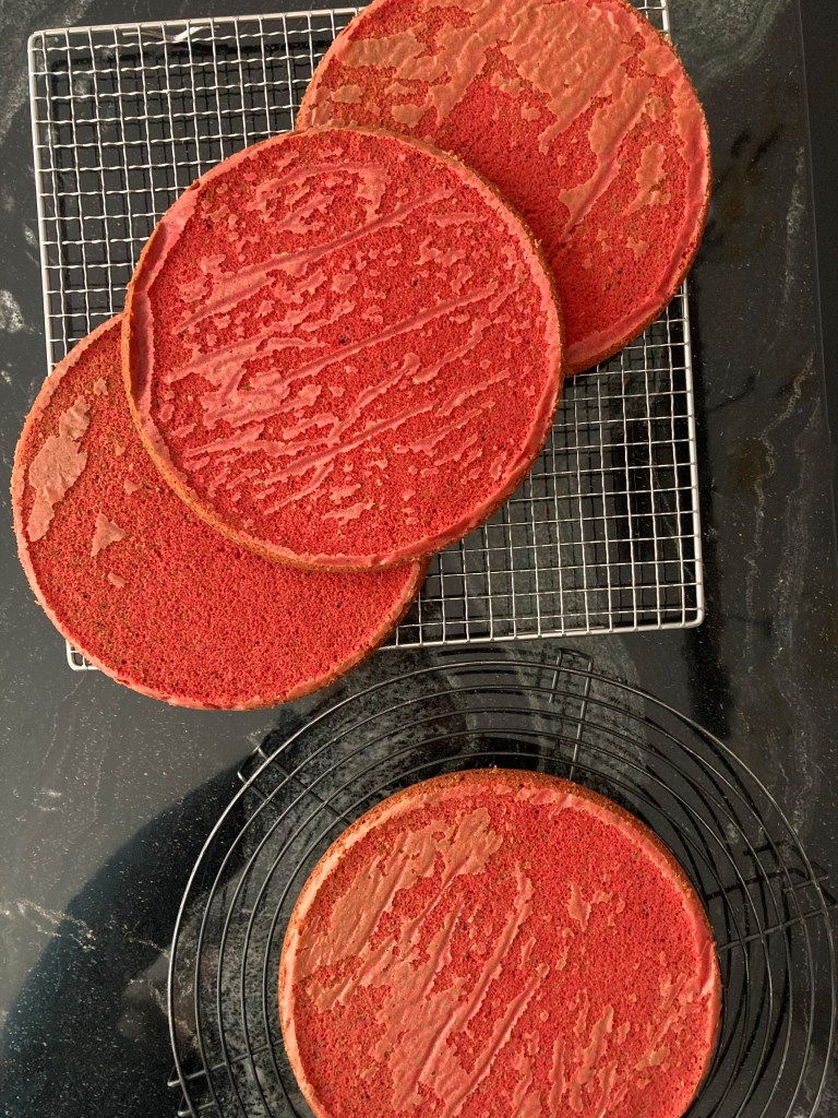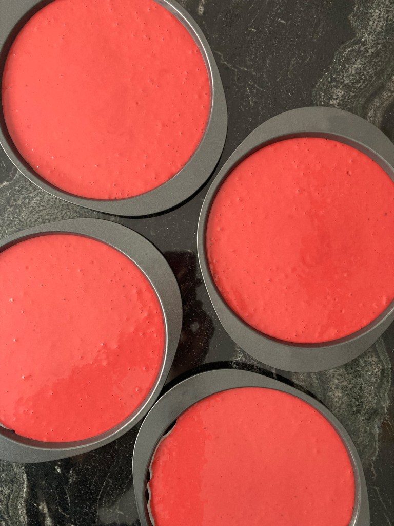 Die Eier mit Feinkristall- und Vanillezucker cremig schlagen. Dann das Öl und die Buttermilch langsam hinzufügen. Das Mehl unterrühren, anschließend auch den Kakao und die Lebensmittelfarbe (→ den Teig nicht zu lange schlagen, weil er sonst speckig wird 😉!). Erst zum Schluss das Natron und den Essig untermischen.