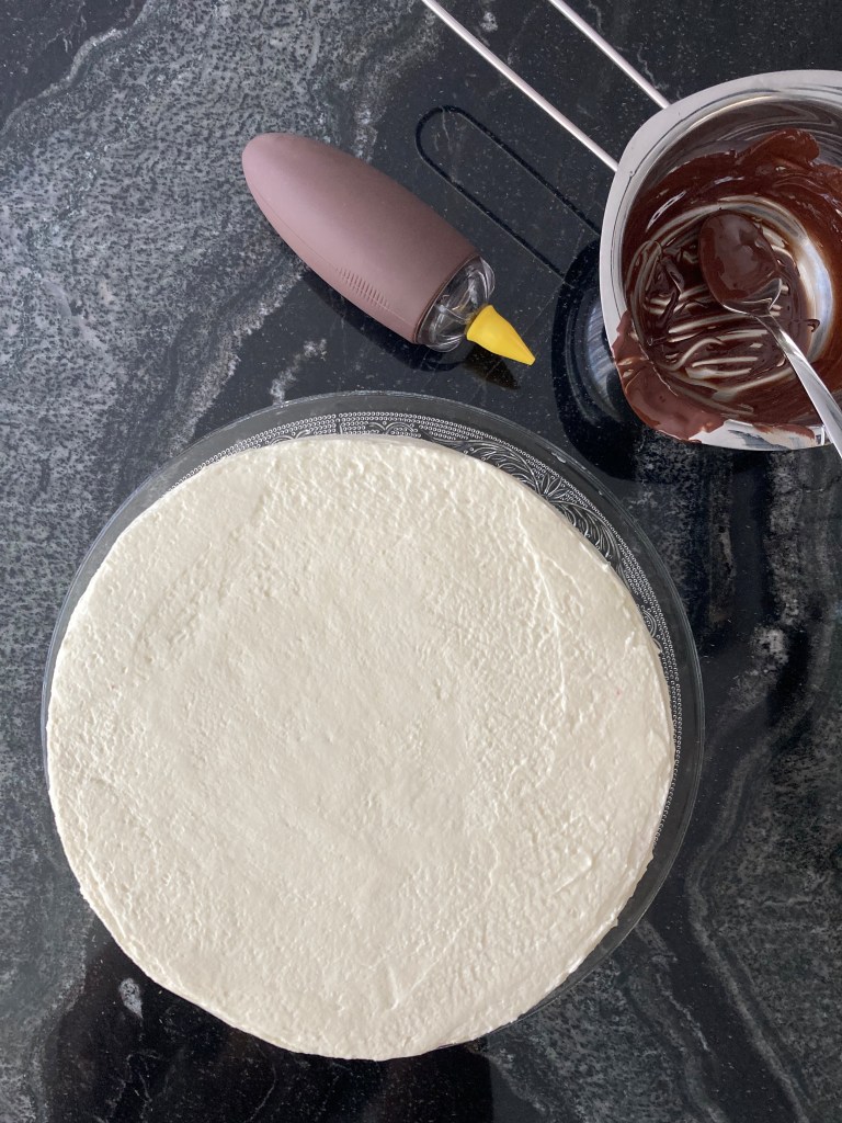 Komposition: Einen Tortenboden auf einen flachen Teller (oder einen Torten-Drehteller) legen und mit einem Teil der Creme bestreichen (ca. 4 gehäufte EL), den zweiten Tortenboden darauflegen, diesen wieder mit Creme bestreichen, danach kommt der dritte Tortenboden, dann wieder eine Cremeschicht und darauf der vierte und letzte Tortenboden. Zum Schluss die Torte rundherum mit der restlichen Creme bestreichen, die Oberfläche glätten und für ca. 1/2 – 1 Stunde in den Kühlschrank stellen.