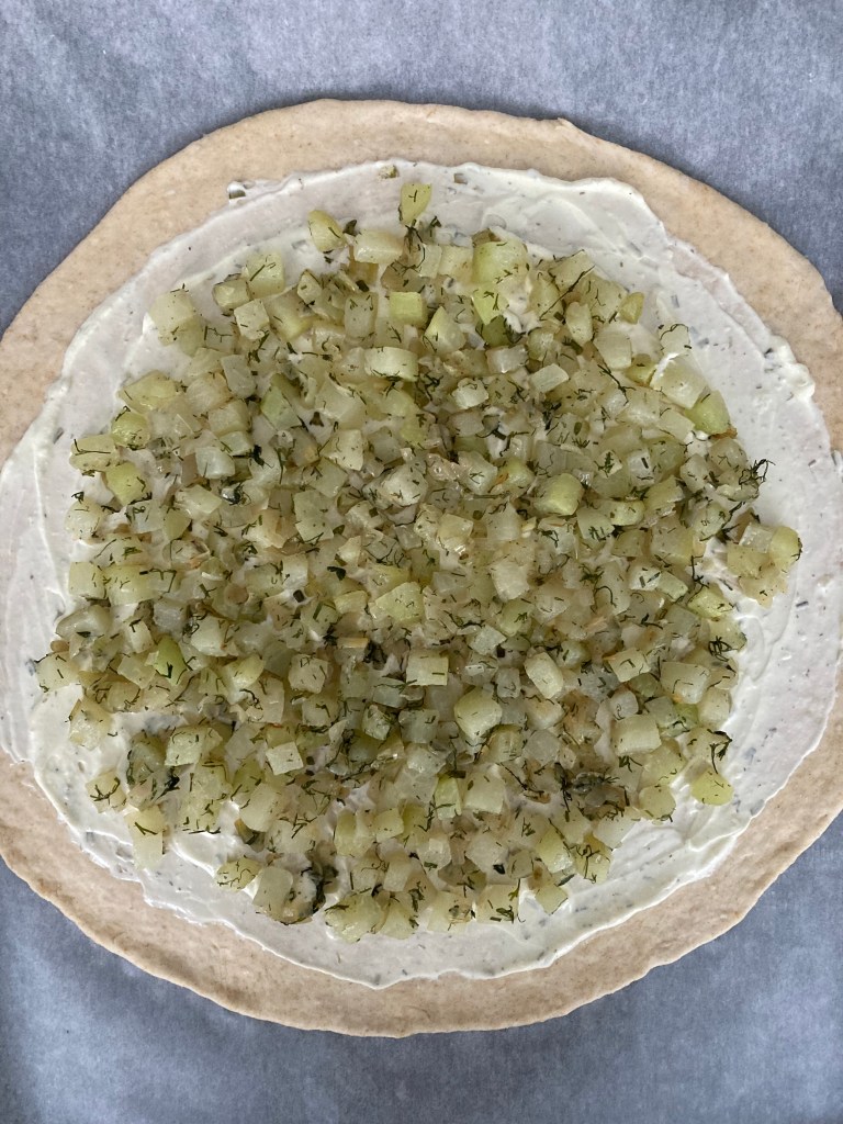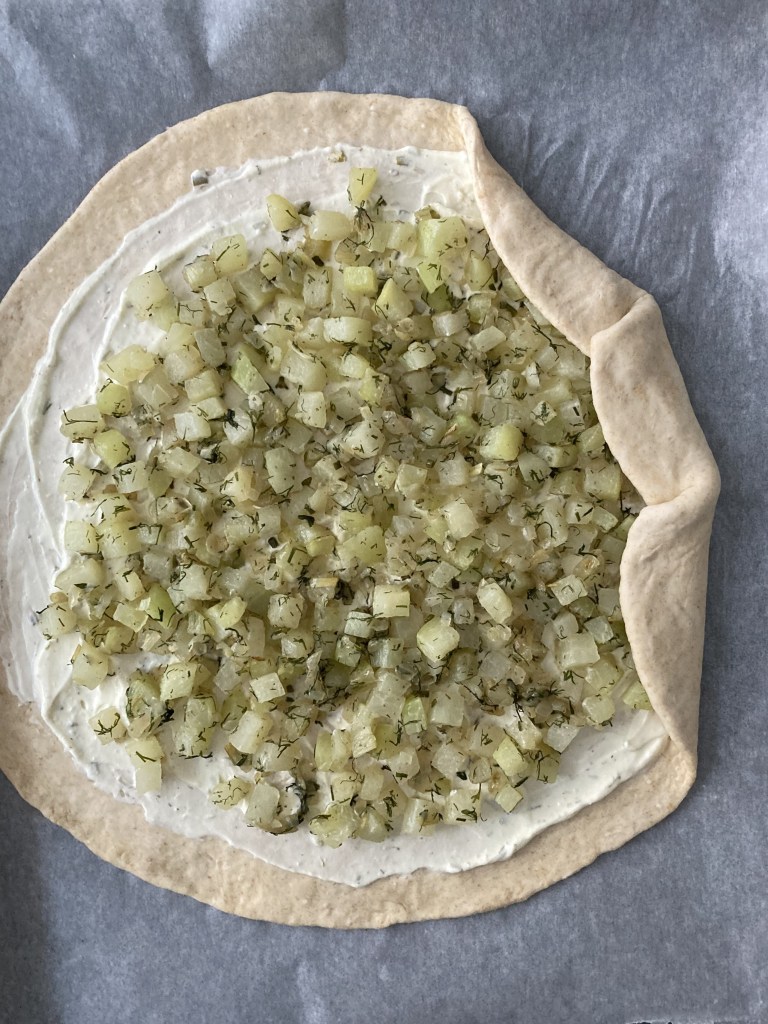 Den Teig auf Backpapier kreisrund ausrollen, mit Frischkäse bestreichen (dabei rundherum einen Rand von ca. 3 cm frei lassen) und die gebratenen Kohlrabiwürfel darauf verteilen. Anschließend den Teigrand vorsichtig einklappen und sanft festdrücken.