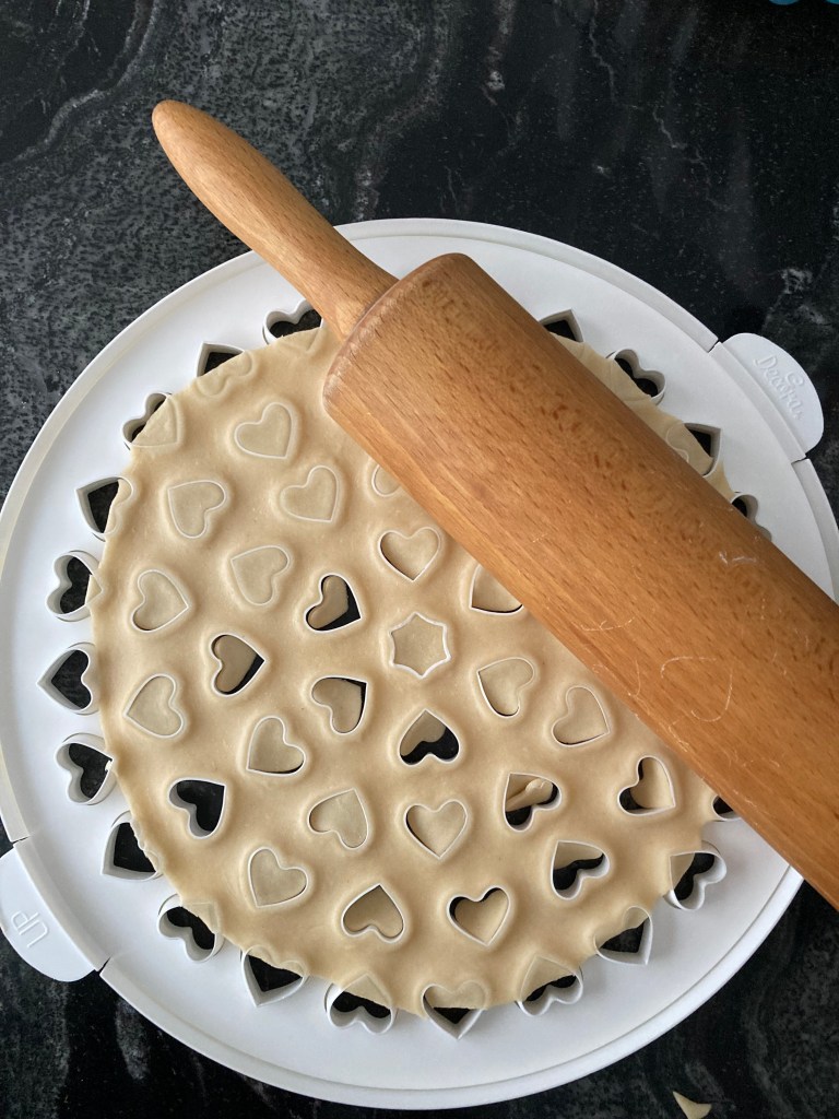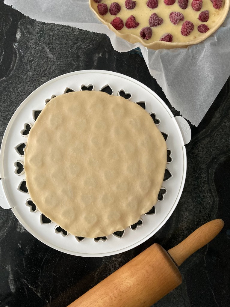 Den restlichen Teig ebenfalls kreisrund ausrollen – dieses Mal aber ca. so groß wie die Form. Den Teigkreis dann mithilfe eines Nudelholzes durch die Gitterstanze** drücken. Dabei das Nudelholz mit sanftem Druck über die Stanze rollen.