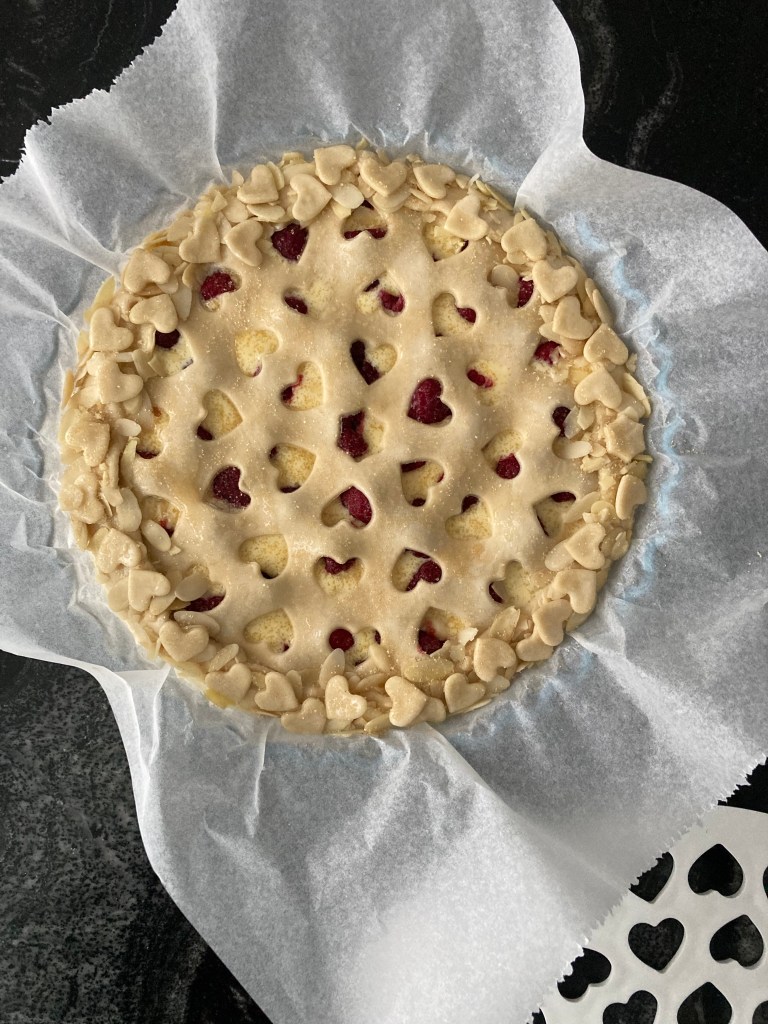 Die herzförmig ausgestanzten Teigstücke mit den Fingern nach unten drücken. → Diese nicht entsorgen! Du kannst damit z.B. den Vlaai-Rand verzieren (so wie hier) – oder du legst sie auf ein Pizzablech und bäckst sie für ein paar Minuten – mit Staubzucker bestreut sind sie ein kleiner, süßer Snack 😉. Das Teig-Gitter auf die Füllung legen. Die Teigränder darüber klappen.