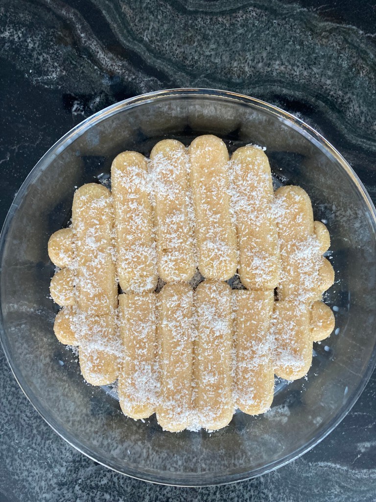 Die restlichen Biskotten ebenfalls tränken und nebeneinander auf die Cremeschicht legen. Mit Kokosraspeln bestreuen und mit dem Rest der Creme bestreichen.