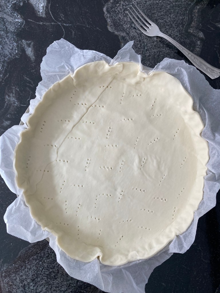 Den Blätterteig passend rund zurechtschneiden (etwas größer als die Form, sodass genügend Teig für den Rand bleibt!).*