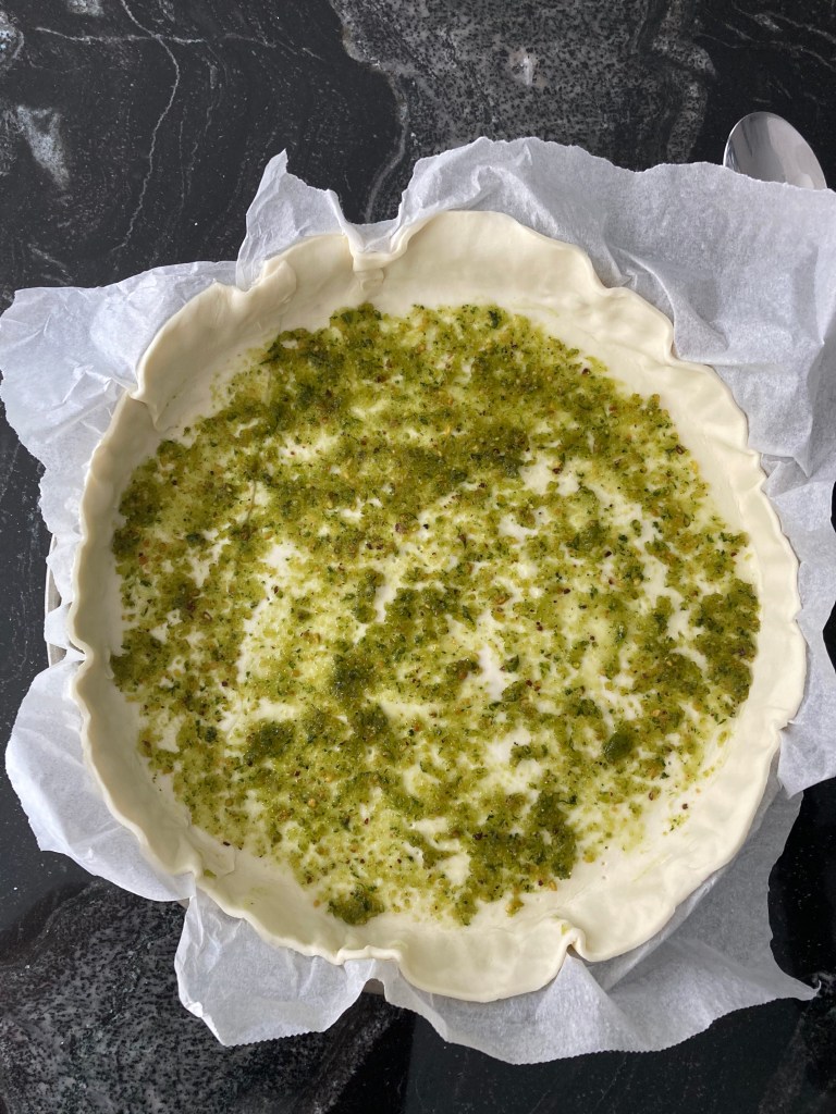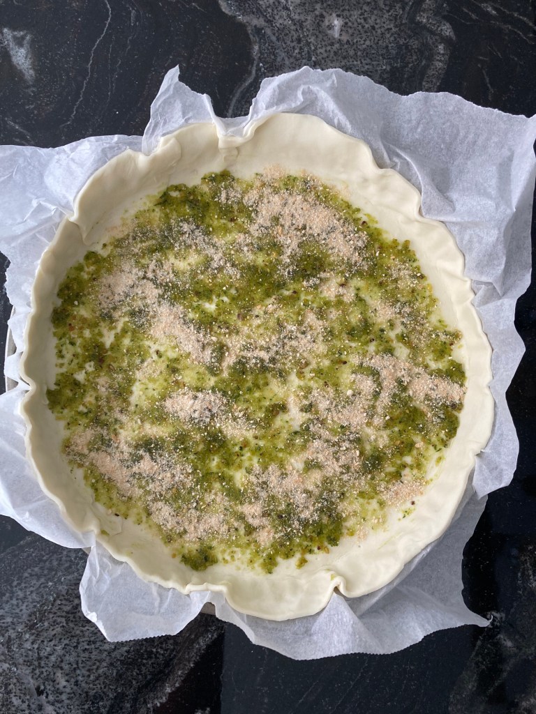 Den Teigkreis (mit Backpapier!) in die Tarte-Form legen. Den Boden mit einer Gabel mehrmals einstechen, dann das Pesto darauf verteilen und die Semmelbrösel darüberstreuen.