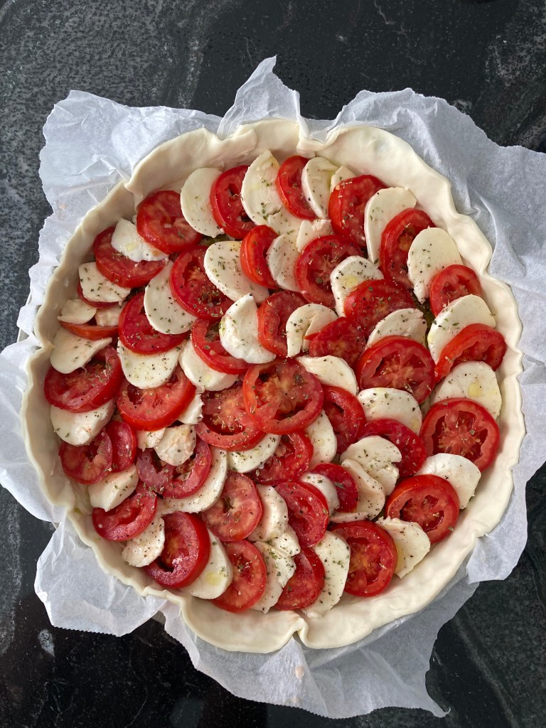 Torta caprese salata, salzig, pikant, Capri, Insalata caprese, Tomaten, Paradeiser, San Marzano, Flaschentomaten, Sugo, Mozzarella, Basilikum, Olivenöl, extra vergine, kaltgepresst, süditalienisch, Blätterteig-Tarte, Sommer-Küche, kreativ, lecker, köstlich, Daniela Terenzi #linzersmileys