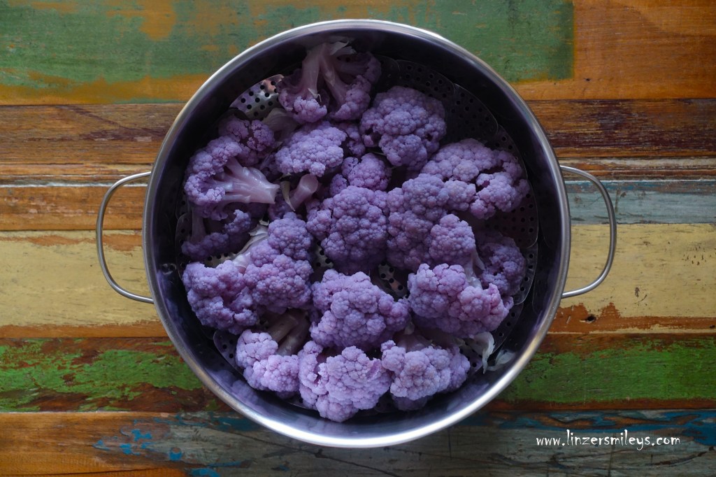 Karfiol ist ein echt fesches Gemüse, finde ich – und dabei auch noch so gschmackig* und gesund! Kein Wunder also, dass ich während unseres letzten Italien-Aufenthaltes an diesem schönen lila Exemplar 😍 nicht vorbeigehen konnte, ohne zuzugreifen …