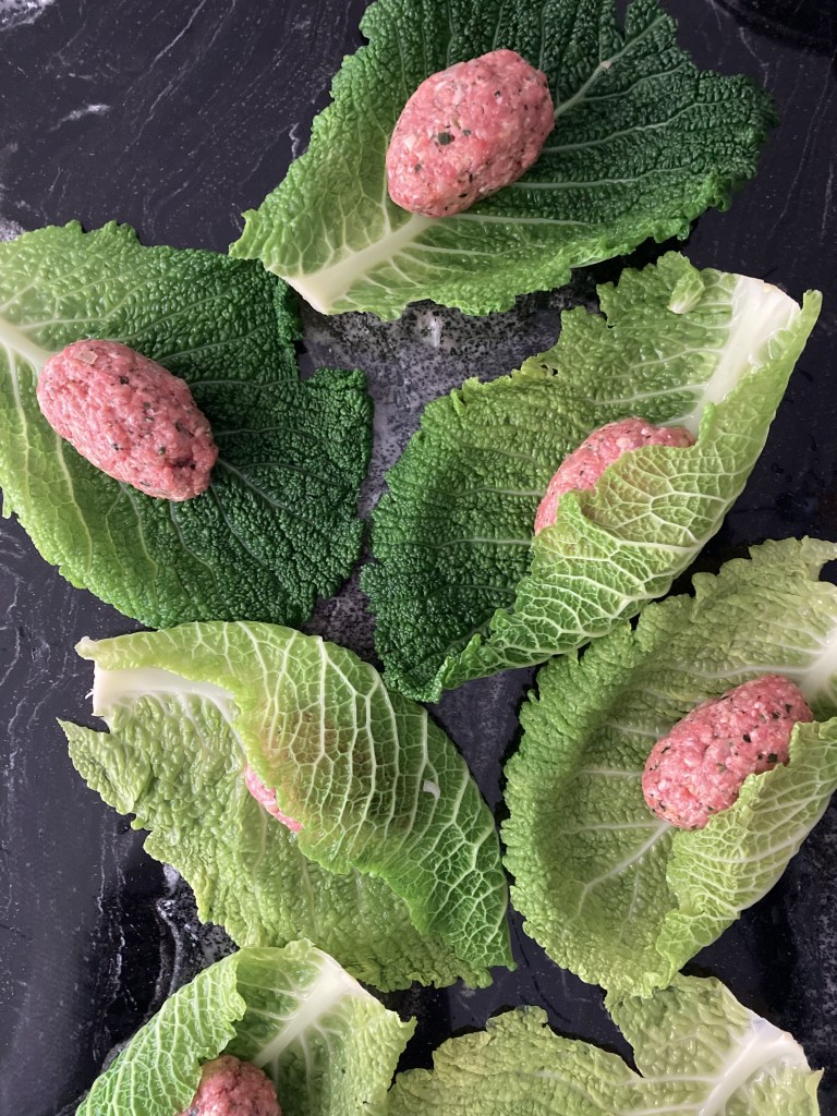 Für die Füllung das Faschierte mit den restlichen Zutaten verkneten und würzen. Aus der Masse 8 längliche Laibchen formen. Diese auf die gut abgetropften Kohlblätter legen, einrollen und mit einer Scheibe Speck fixieren.