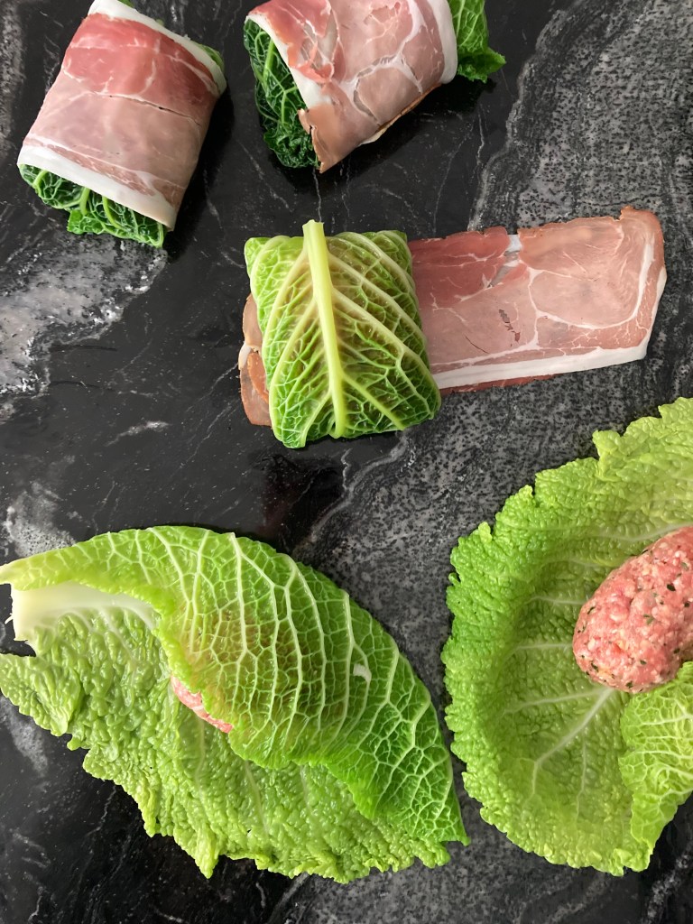 Die dicken Rippen der Kohlblätter entfernen bzw. flach abschneiden. Die Blätter dann für ca. 3 Minuten in Salzwasser kochen, herausnehmen, mit kaltem Wasser abschrecken und gut abtropfen lassen.