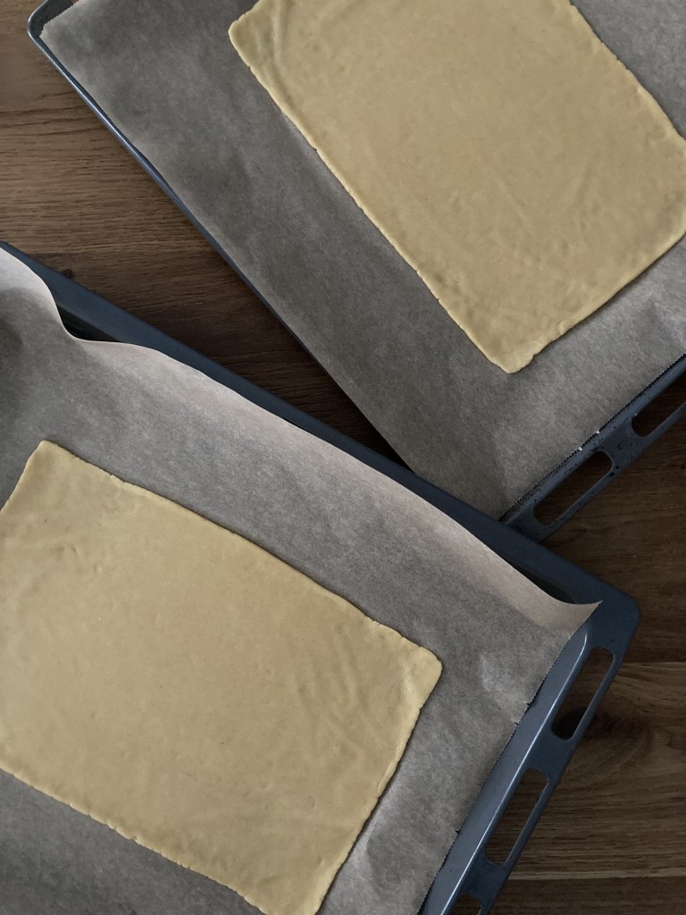Die 4 Teigrechtecke nacheinander im vorgeheizten Ofen bei 180°C (Ober-/Unterhitze) jeweils für ca. 8 Minuten goldgelb backen. Herausnehmen und auskühlen lassen.