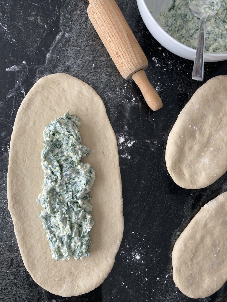 Den Teig in 3 Teile teilen. Jedes Teigstück oval ausrollen. Mittig mit Füllung bestreichen. Die Teigränder anschließend vorsichtig aufrollen. Die Teigenden zusammendrehen und festdrücken.
