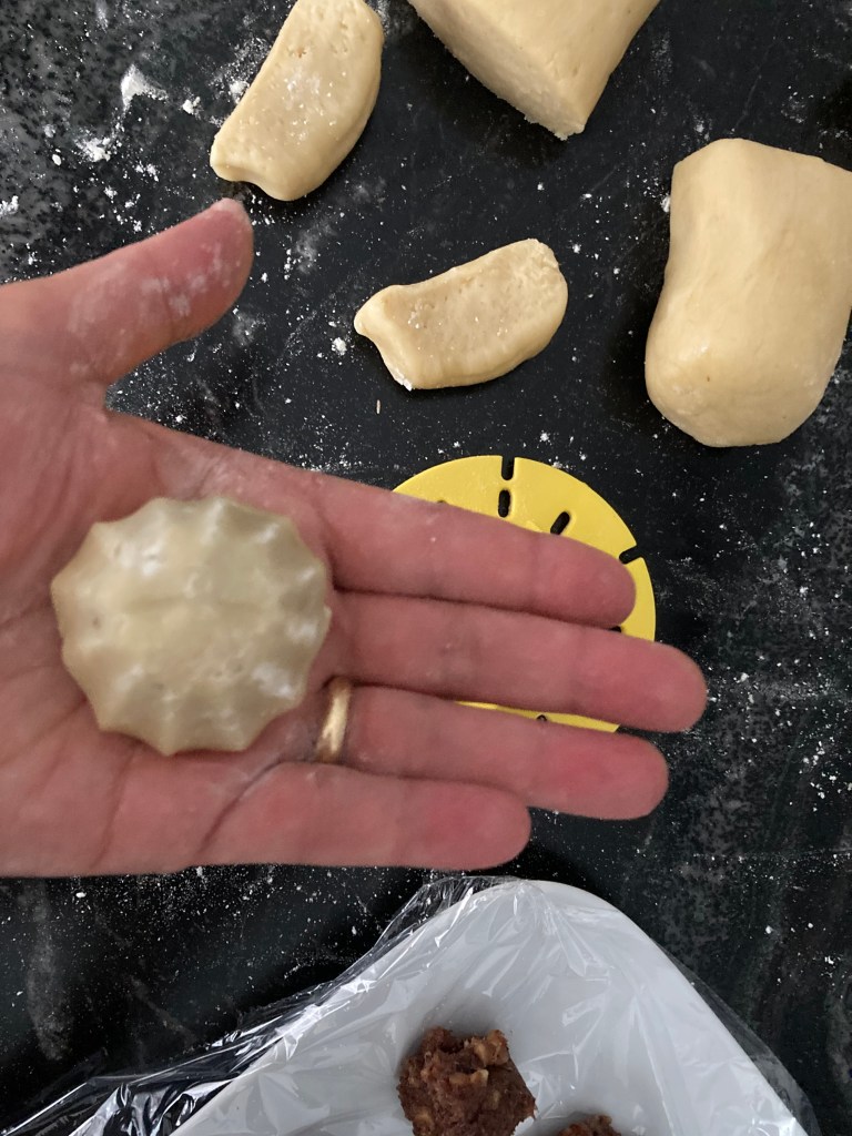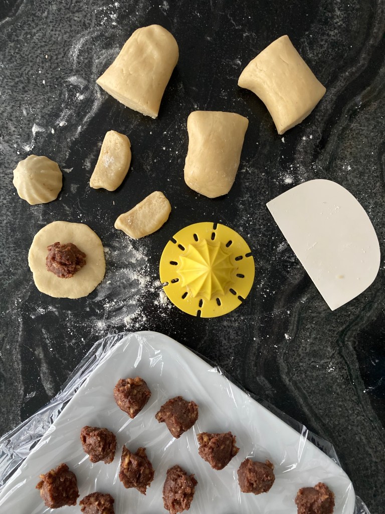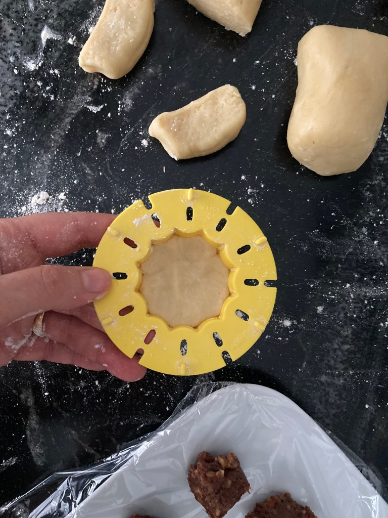 Traditionell werden diese köstlichen Kekse mithilfe einer hübsch verzierten Hohlform („Ma’amoul-Löffel“) zubereitet. Da ich (immer noch) keinen Ma’amoul-Löffel besitze, habe ich die Zubereitungsart seinerzeit und in weiterer Folge viele andere Male einfach „italianisiert“ und einen Ravioli-Ausstecher verwendet 😊.