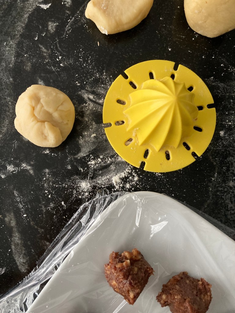 Den Teig in 20 gleich große Stücke teilen. Jedes Teigstück kreisförmig flachdrücken, dann mittig eine Portion der Füllung geben. Die Teigenden so verschließen, dass ein kleiner Knödel entsteht. Diesen gut bemehlen und mit der Verschlussseite nach oben in den (gut bemehlten) Hohlraum der Zitruspresse drücken (eine andere Option wäre es vielleicht, den Hohlraum mit Frischhaltefolie auszukleiden 💡!). Den Keks anschließend vorsichtig aus der Form klopfen (bitte Geduld – manchmal bedarf es dabei auch mehrerer Versuche 😉!). Die fertig geformten Kekse auf ein mit Backpapier ausgelegtes Backblech legen …