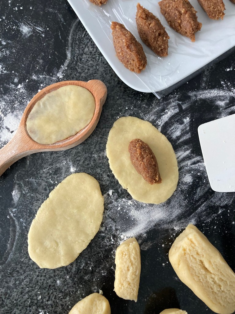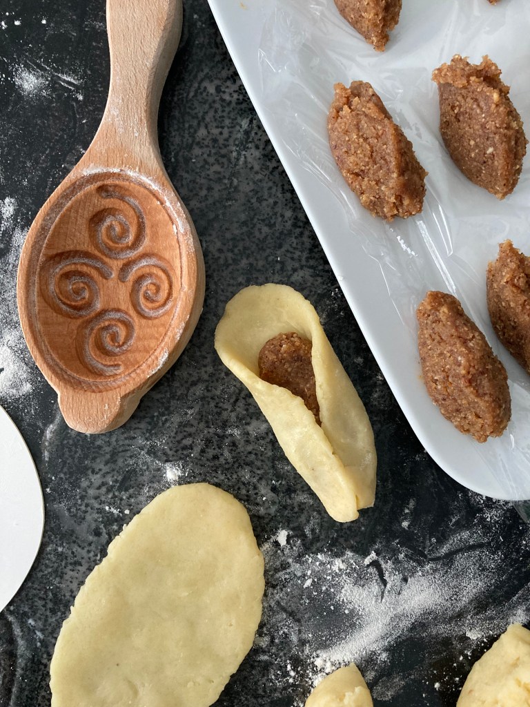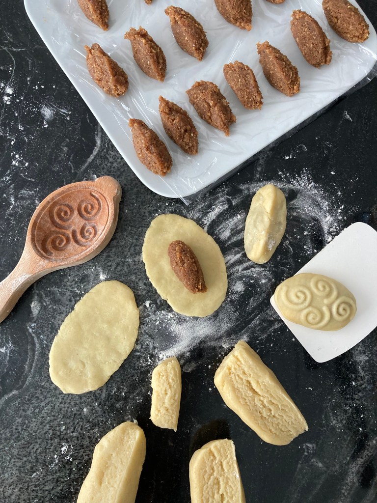 Ma’amoul auf Österreichisch, gefüllte Osterkekse mit Nüssen, Nussstrudelfüllung, Hohlform aus Holz, hübsch verziert, DIY Ostereier-Kekse, ohne Ei, vegetarisch, einfach zu veganisieren, lecker, kreativ, Ostersonntag, Ostermontag, Osterhase, süßes Osternest, Ma’amoul-Löffel aus Syrien, Dattelkekse, Rezept von Daniela Terenzi, Foodblog #linzersmileys
