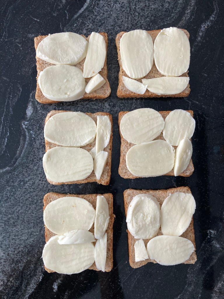 Die Scheiben anschließend auf der halben Menge (hier 6) Toastbrotscheiben verteilen, dann salzen und pfeffern. Die restlichen Toastbrotscheiben darauflegen und gut! andrücken. Die „Toasts“ danach diagonal halbieren.