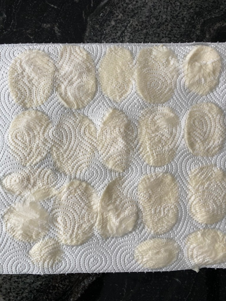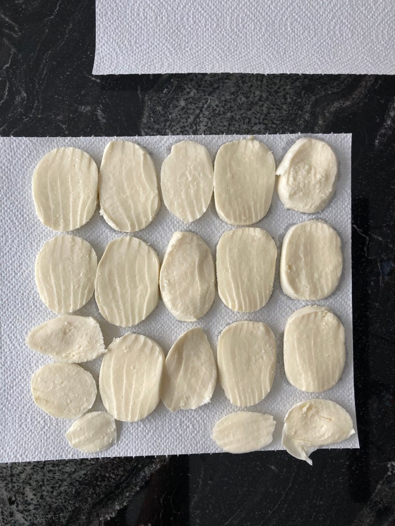 Die gut abgetropften Mozzarellakugeln in Scheiben (max. 1 cm dick) schneiden. Diese dann zwischen 2 Lagen Küchenpapier legen und trockentupfen.