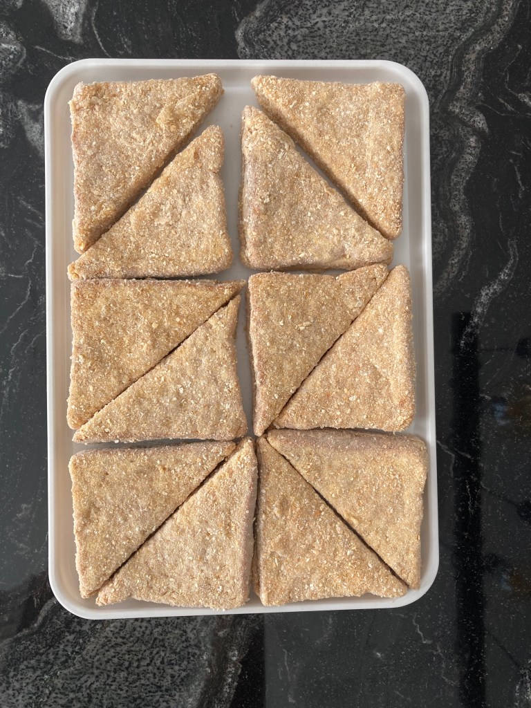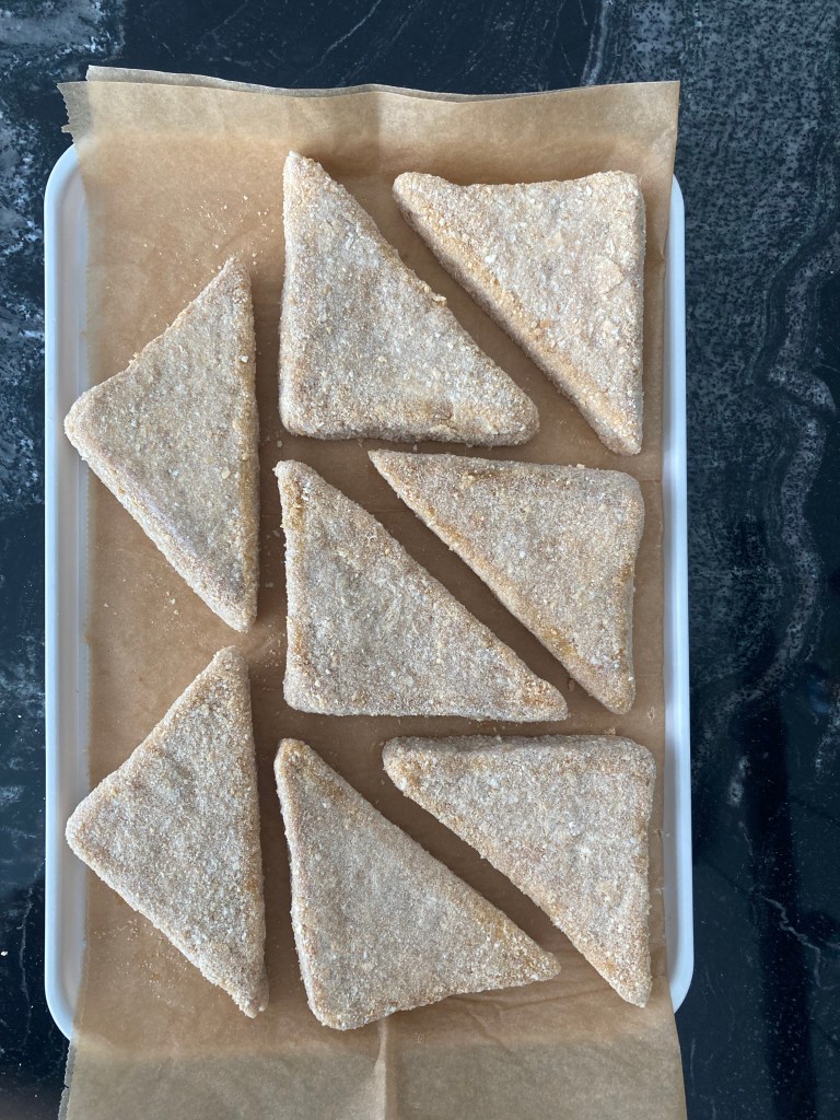 → Die Dreiecke vor dem Frittieren nochmals für ca. 30 Minuten in den Kühlschrank stellen.*