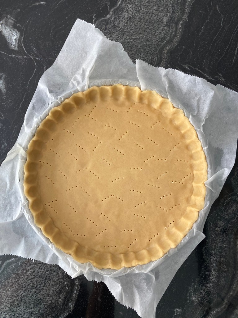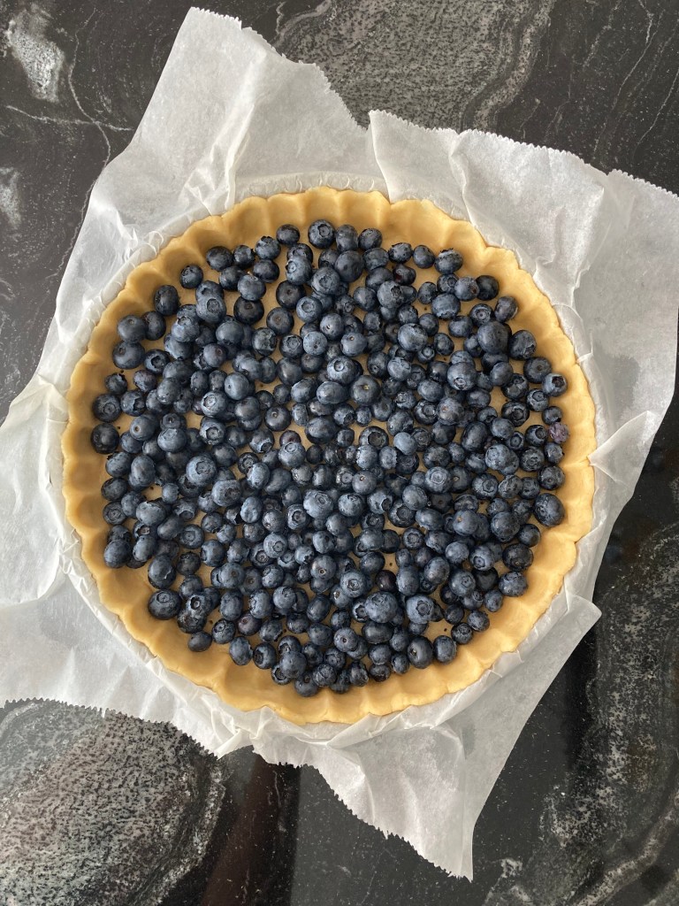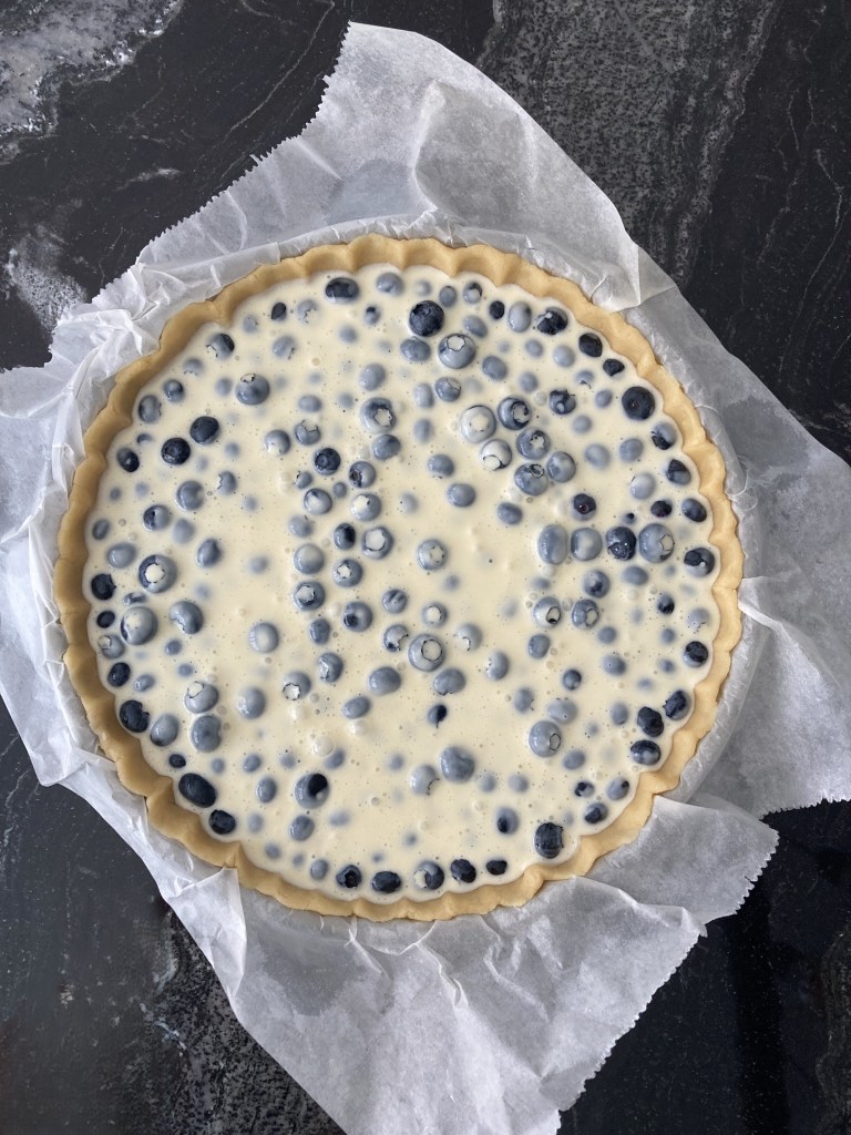 Auf einem Brett den Mürbteig bereiten: Mehl, Backpulver und Butter mit den Fingern verreiben („abbröseln“), dann die restlichen Zutaten hinzufügen. Alles gut zu einem Teig verkneten. Diesen anschließend auf Backpapier kreisrund ausrollen (etwas größer als die Form 😉). Teig samt Backpapier in die Form legen und einen Rand formen. Den Boden mit einer Gabel mehrmals einstechen und die Heidelbeeren darauf verteilen.