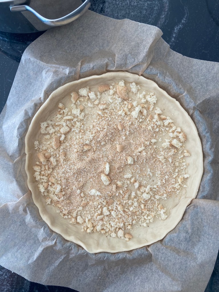 Ca. 2/3 des Hefeteiges auf Backpapier kreisrund ausrollen (ein wenig größer als die Form, so entsteht ein Rand). Den Teig dann mit dem Backpapier in die Form legen. Mit einer Gabel mehrmals einstechen, die Biskotten-Brösel darauf verteilen und die Fruchtmasse einfüllen.