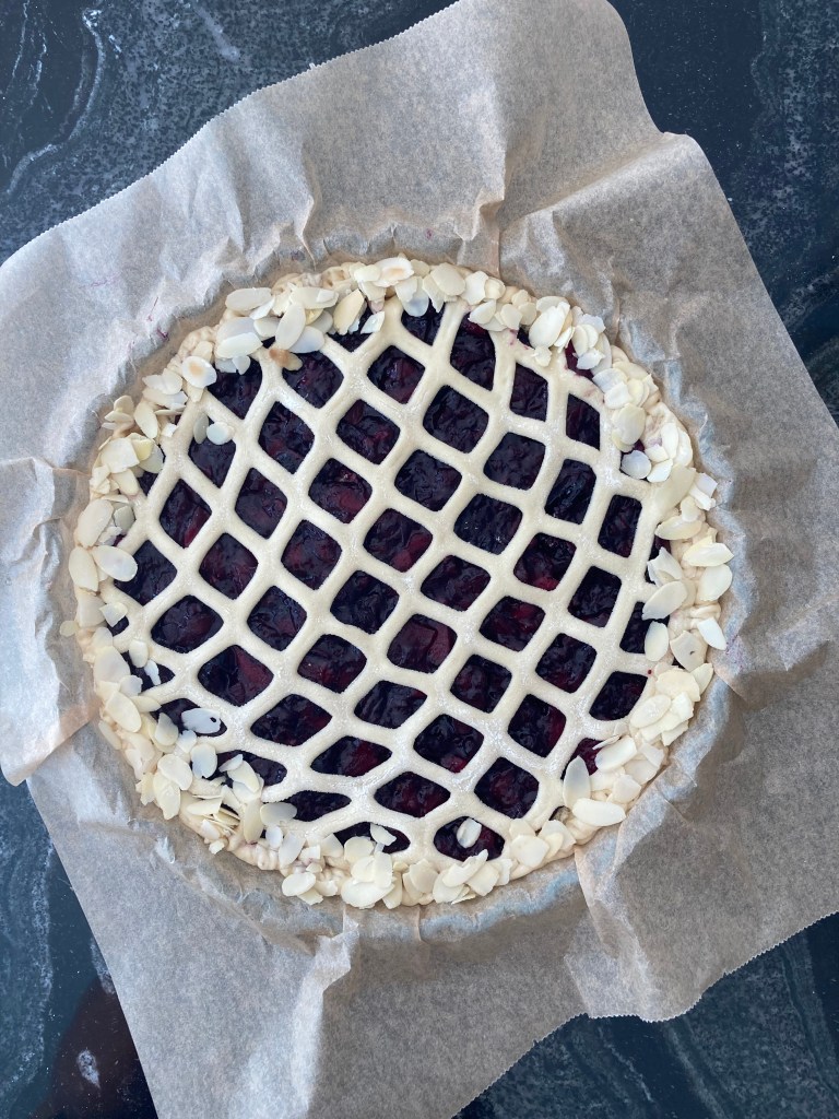Die rautenförmig ausgestanzten Teigstücke mit den Fingern nach unten drücken (diese nicht entsorgen! Ich lege sie auf ein Pizzablech und backe sie für ein paar Minuten – mit Staubzucker bestreut sind sie ein kleiner, süßer Snack. Das Teig-Gitter auf die Weichsel-Füllung legen. Die Teigränder darüber klappen.