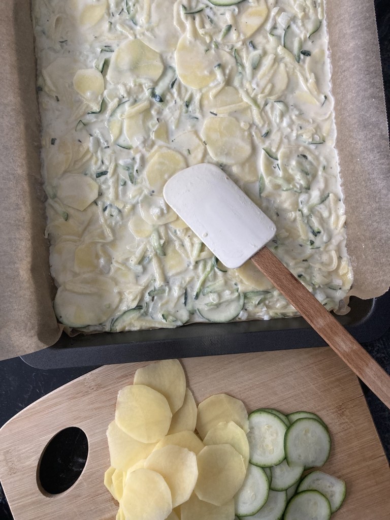 Die restlichen Kartoffeln sowie die restliche halbe Zucchini in feine Scheiben hobeln. Einige schöne Scheiben beiseitelegen, die restlichen in die Schüssel mit der Gemüsemischung geben und (mit einem Spatel) unterheben.