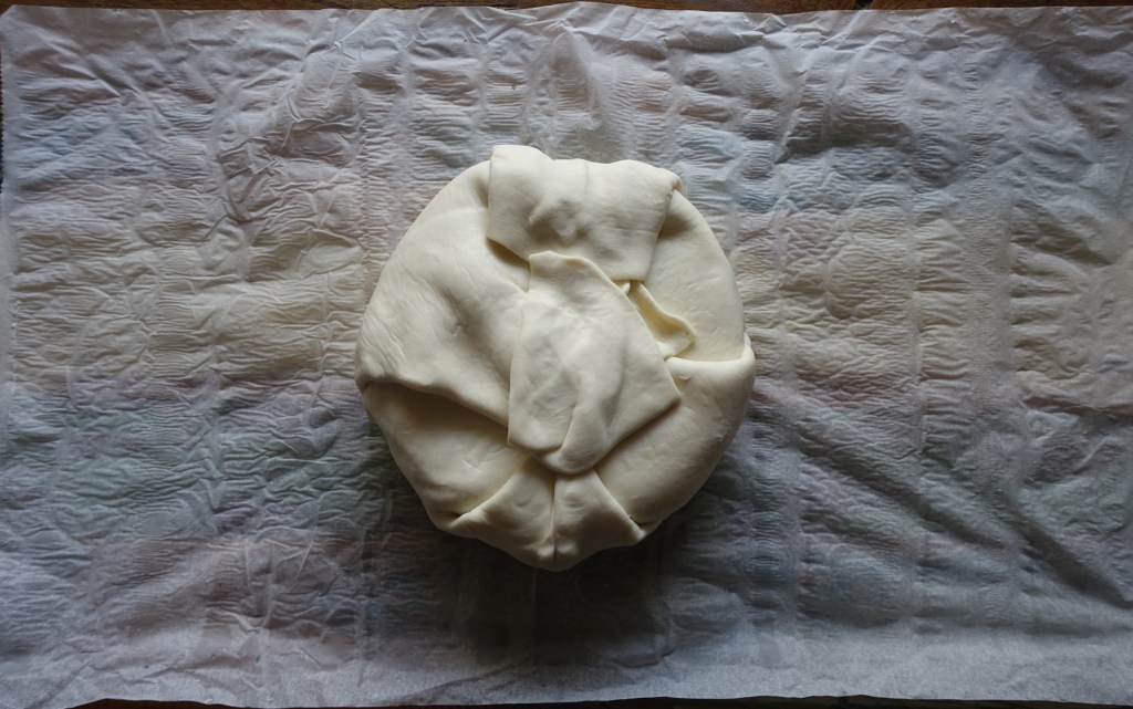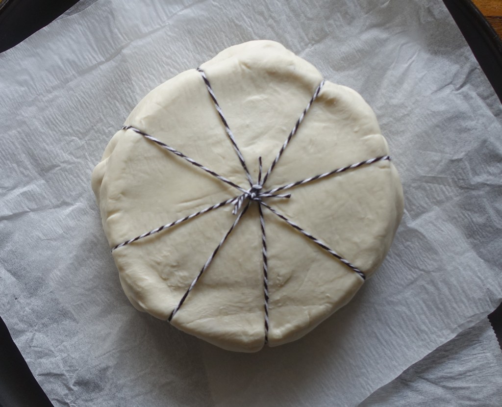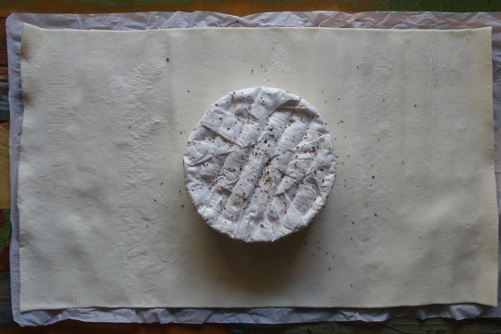 Den Ofenkäse nach Belieben würzen. Diesen dann mittig auf den Blätterteig legen. Die Teigenden über den Käse legen und gut zusammendrücken – es sollte ein rundes Päckchen entstehen. Anschließend Küchengarn darum wickeln (Achtung, bitte nicht zu fest – der Teig sollte keinesfalls einreißen 😉!) und in der Mitte verknoten. Das Teigpäckchen noch mit Eigelb bestreichen und im vorgeheizten Ofen bei 200°C (Ober-/Unterhitze) für ca. 20 Minuten goldbraun backen.