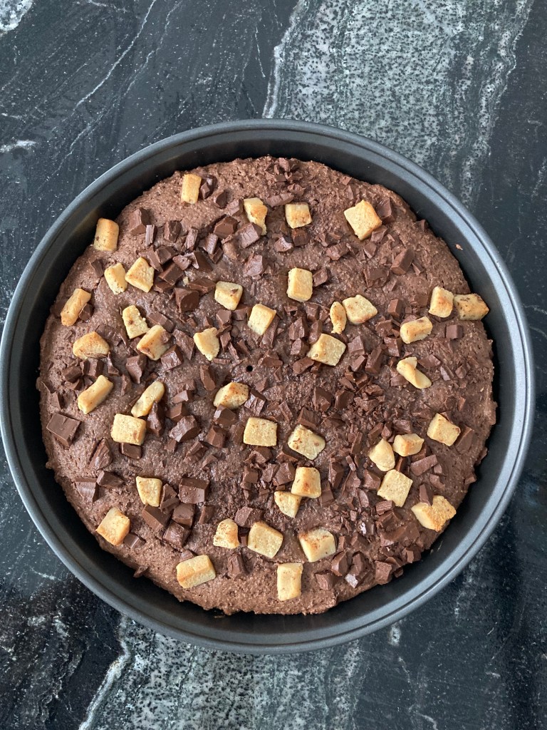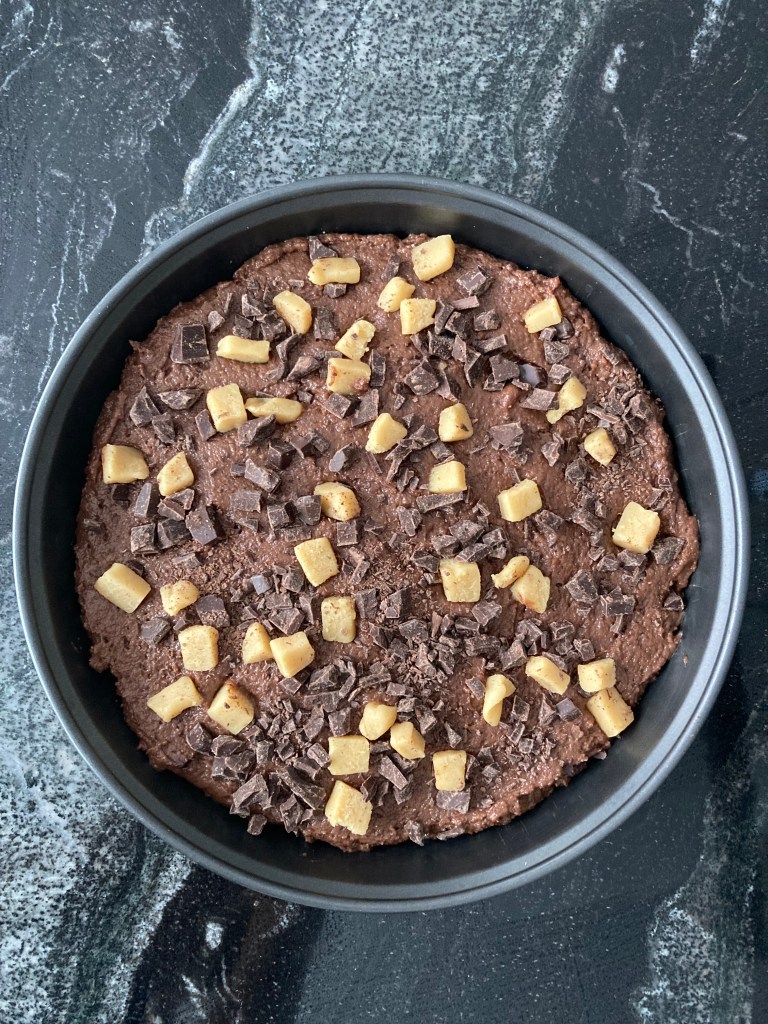 Den Boden der Backform mit Backpapier auslegen. Den Teig in die Form füllen, dann glattstreichen und mit der gehackten Schokolade sowie den Marzipanstücken belegen. Den Kuchen anschließend in den vorgeheizten Backofen schieben (180°C, Ober-/Unterhitze) und für ca. 18 Minuten backen. Herausnehmen und vollständig auskühlen lassen.