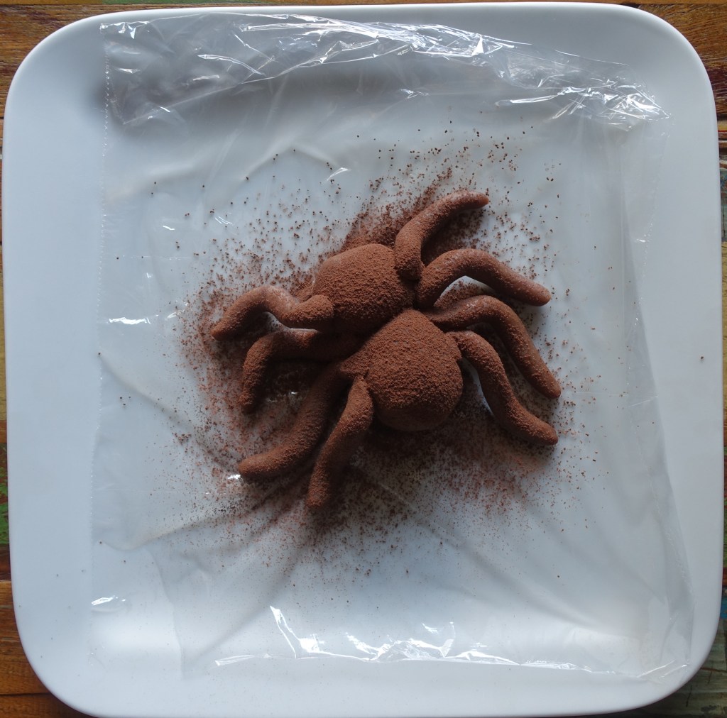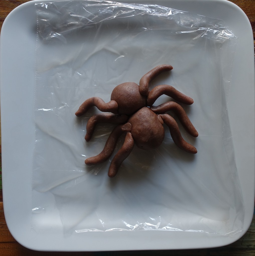 Für die Marzipanspinne 🕷️ das Marzipan mit dem Kakao und dem Staubzucker gut verkneten. Aus ca. einem Drittel der Masse 8 lange Rollen für die Beine formen. Aus dem Rest 2 Knödel für den Spinnenkörper drehen (einer davon sollte etwas größer als der andere sein). Diese dann auf einem Teller (am besten auf einem Stück Frischhaltefolie) zusammensetzen und die Beine seitlich befestigen. Die Spinne zum Schluss noch mit etwas Kakao bestreuen …