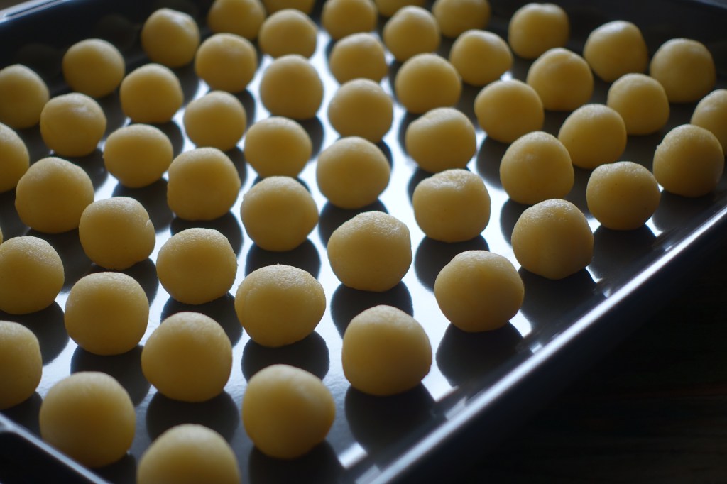 Auskühlen lassen, anschließend kleine Bällchen formen. Diese auf ein Backblech legen und bei Zimmertemperatur mehrere Tage lang trocknen lassen (5).