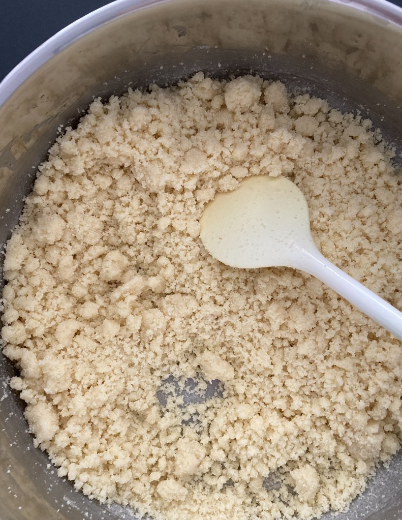 In einem Topf mit dickem Boden die Butter schmelzen. Zucker und Vanille hinzufügen. Sobald der Zucker geschmolzen ist, das Obers unterrühren. Anschließend den Grieß dazugeben und unter ständigem Rühren ca. 10-15 Minuten lang rösten. Dabei verändert die Masse ihre Konsistenz: Am Anfang ist sie breiig (1), später grob bröselig (2), am Ende fast sandig (3).