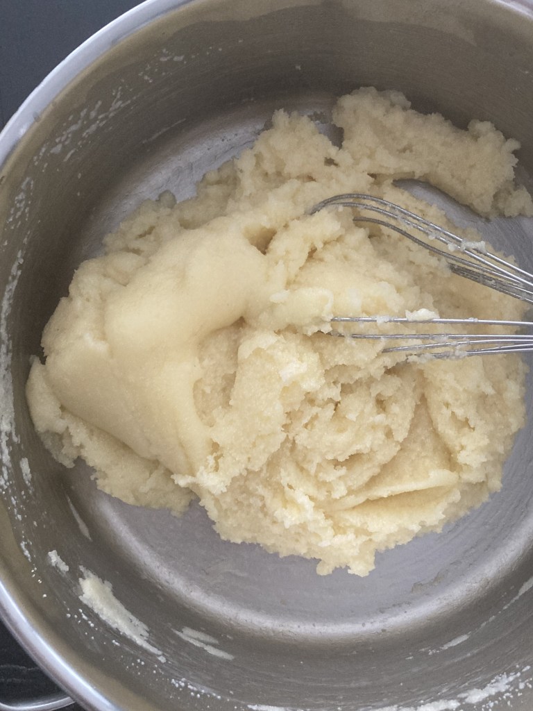 An dieser Stelle das Wasser langsam dazu gießen (währenddessen mit einem Schneebesen kräftig rühren!). Wenn sich die Masse vom Boden löst (4), den Topf von der Herdplatte ziehen und die Aromen unterrühren.