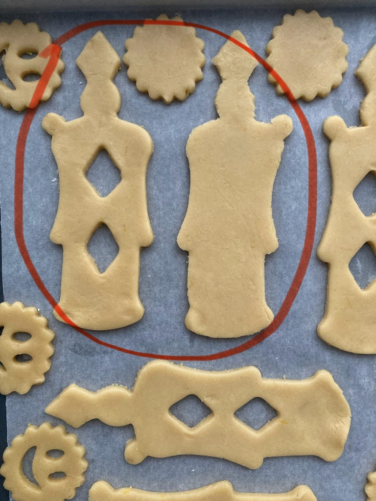 ACHTUNG: Eine Hälfte der Nikoläuse musst du umdrehen und spiegelverkehrt aufs Blech legen!